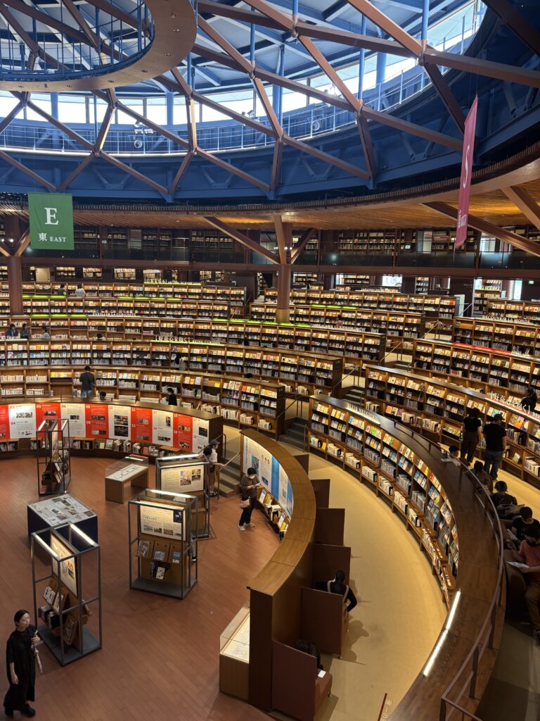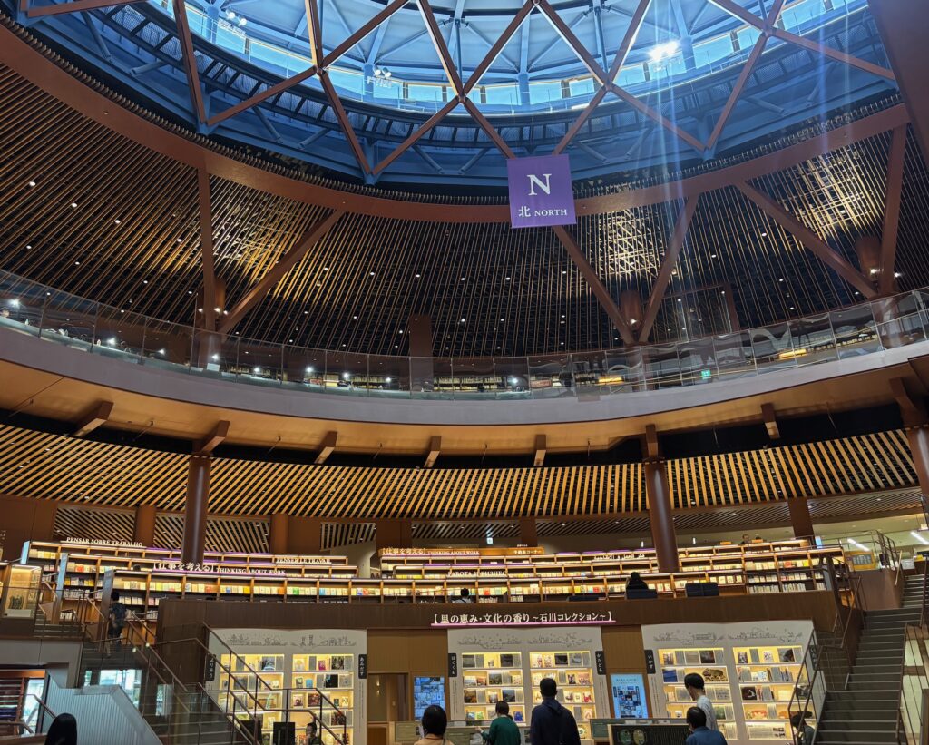 2022年7月にリニューアルオープンした石川県立図書館です。一度訪れたかったこの場所に、オープン3年目にやっと行くことができました。市内中心地にあったもとの場所からは少し離れた台地に移転し、地の利は不便になりましたが、建物に入ると目前に圧巻の光景が広がります。